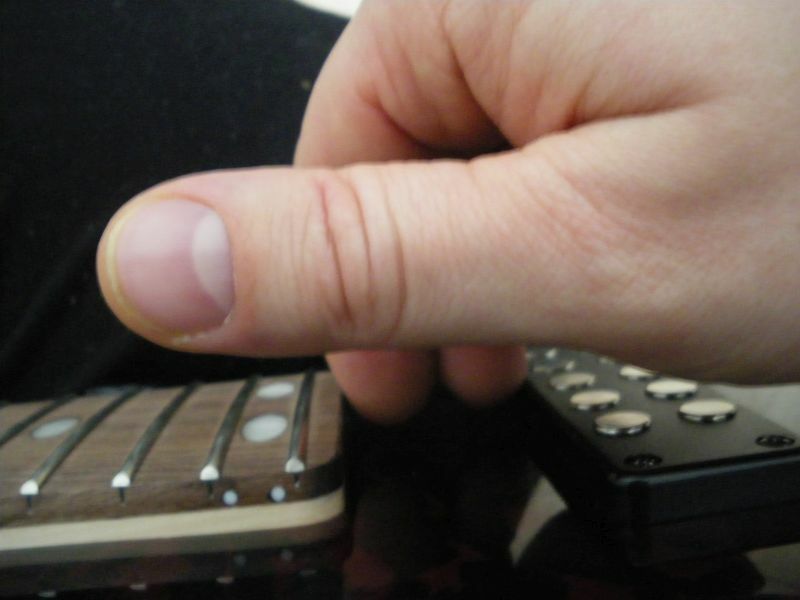 Én ilyenkor a húr mellé teszem mindkét ujjam egyszerre. Ha „beleakad” valamibe hozzáérek valamihez az zavar, mert olyan gitáron próbáltam elsőre, ami 20 bundos és emiatt ha a nyak végén ütöttem meg hüvelykujjal akkor a mutató és a középső ujjamnál nyilván nem volt semmi csak a húr és alatta a test, mert annak rövidebb a nyaka, így a hangszedők hátrébb vannak, potméterek pláne sehol, így azt is megszoktam, hogy a behajlított kisujjam és gyűrűsujjam ujjpercei tudnak csúszni a testen, amikor hüvelykujjal már a D-nél vagyok . Ha ott a poti akkor nem.