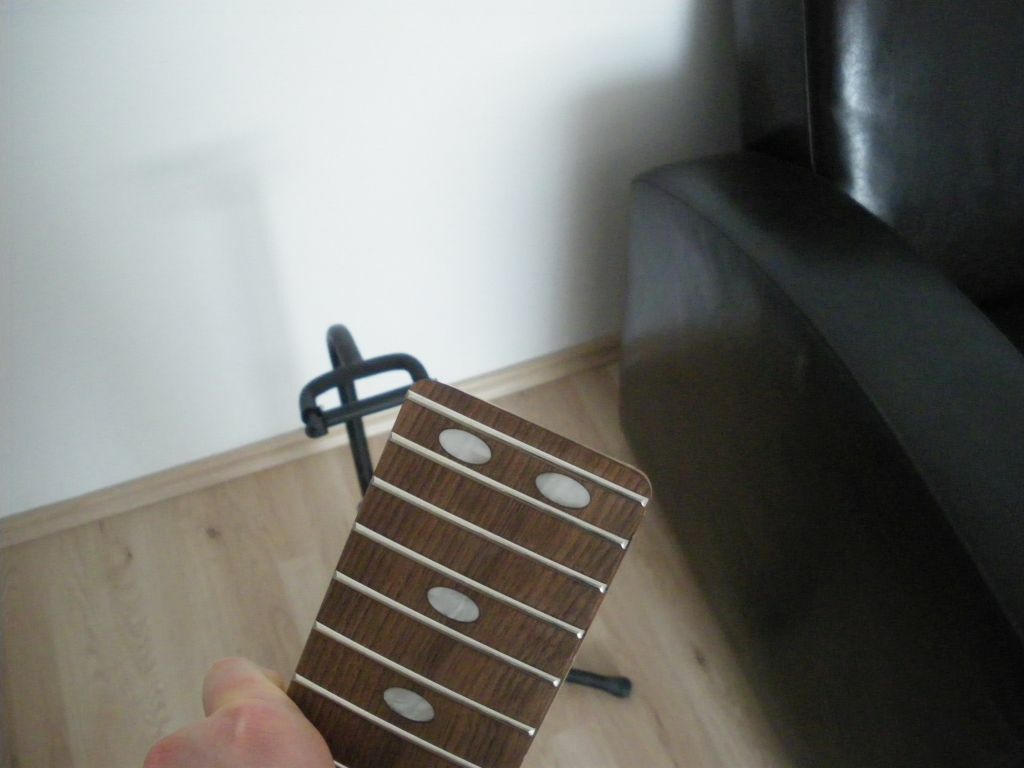Felhúroztam és kevés a hely így is, éppen csak, de kevés. Két ujjam éppen nem fér be egymás mellett a nyak és a hangszedő közé és ahogy elakad az meg is zavar. Szóval nem sokat nyertem eddig vele tehát vagy csak fingerstyle ezen a gityón vagy kénytelen leszek teljesen leszedni a fogólapot a nyak végéig és egymással síkba egyformára csiszolni kinéz, ahogy kinéz. Úgy is éppen csak hogy elég lesz a hely, mert még olyan 7-8mm túllógás maradt csak rajta, szóval nagyon pont ott kell maradni jobb kézzel.