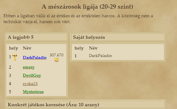 (ui.1. a 23-ik helyezésem a Becsületre vonatkozik, nem az arénára, ott 1 és 12 között ingázok. Nálunk, 89-es szinten nagyon kiegyenlített a mezőny, 10 ezer arany fölé nem kúszik a fejpénz. Persze ha kicsit költenék rá, akkor tudnám használni a 106-os szintű ruháimat, amikkel behozhatatlan előnyre tennék szert a többiekhez képest, de a franc aki fizet érte.)