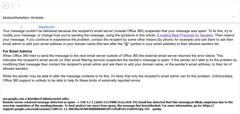 Segítséget kérek. Adott egy kis kft, aminek outlook.hu-s email címe van. Ezt a tulajdonos használja telefonon, de szinte csak annyira, hogy a hétközben beérkező levelekre válaszol egy OK-t vagy esetleg 1-2 bővített mondatot. Hétfőn-kedden viszont megyek segíteni neki a hirdetéseket elkészíteni, és a kész hirdetéseket jóváhagyásra elküldeni a megrendelőnek. Eddig teljesen jól ment minden, viszont múlthéten a gmail-es email címekre nem mentek ki a levelek, mert a gmail kéretlennek minősítette. Akkor sem, ha a megrendelés emailben érkezett gmailes címről, és arra válaszoltam. Évek óta állandó partnereknek sem. Próbáltam a sajátomra, ahonnan már sokat küldtem ezt-azt, és arra sem.