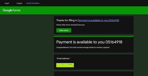 Ugy értem, hogy valamikor rákattintottam egy linkre amire nem kellett volna és azóta a google form naponta küldözget olyanokat, hogy köszönik hogy kitoltottem a kérdőivet és ennyi és enyni pontom van. valami orosz oldal.