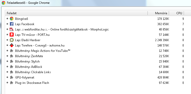 Nekem meg alapból fut a Gmail checker, a Hangouts (mert ugye nincs asztali alkalmazása, vagy csak én nem találtam még...), a Lastpass, a Onetab, az Adblock Plus és természetesen az Adblock for Pirate Bay, mert ugye az Adblock Plus-ba ezt már nem tudták megoldani a kedves fejlesztők... -