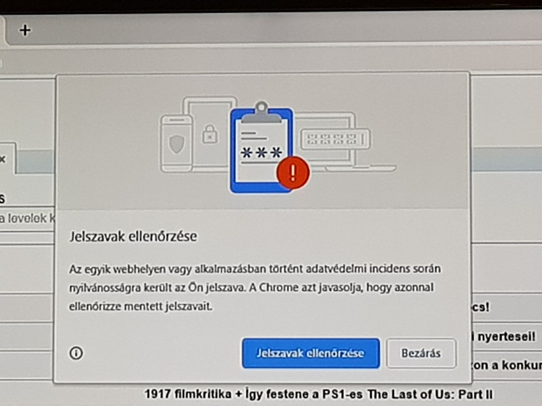 A kiszivárgott jelszó, amire a Chrome jelzett, ha használtad máshol is, ott is meg kell változtatni másra. -