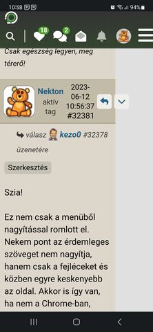 Ez nem csak a menüből nagyítással romlott el. Nekem pont az érdemleges szöveget nem nagyítja, hanem csak a fejléceket és közben egyre keskenyebb az oldal. Akkor is így van, ha nem a Chrome-ban, hanem az android beállításokban állítom a betűméretet. Alap 100%-on is keskenyebb az oldal.