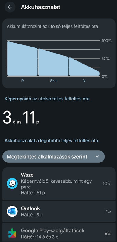 nálam szintén, ami amúgy oké. napközben, aktív használat közben. ma reggel mentünk egy kört - lidl/praktiker - 10:30-ra hazaértünk, 100%-kal vettem le a telót az autóról.most van 4 óra és 90%-on van a telefon! ok, nem sokat vettem a kezembe, mert kint voltam a kertben, de azért volt pár üzenet váltás, pár szó a google nesttel, de semmi extra. ez ~ 5 óra, alatt 10%. éjszaka meg 7-8 óra alatt merül 35%-ot is, agyf.sz, rohadt idegesítő