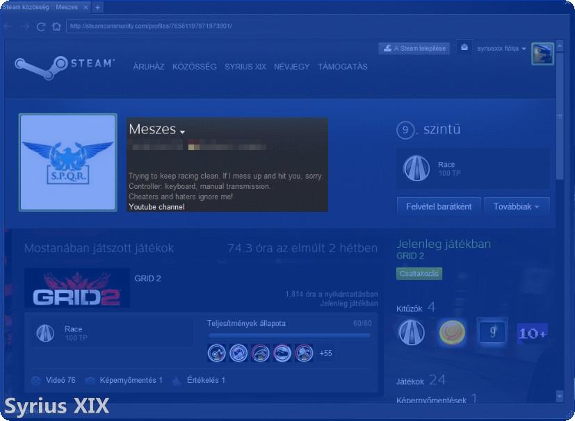 Akiket én felvettem (ill. felkértem) barátnak, azok mind a GRID 2 miatt lettek (tekintettel arra, h nekem más Steam-es játékom nincs is, sőt még tovább megyek, ha a GRID 2 nem lenne Steam-hez kötve, akkor a mai napig nem lenne Steam-em sem). Egyéni véleményem (tudom), de én még a mai napig nem találtam semmi poént a Steam-ben!