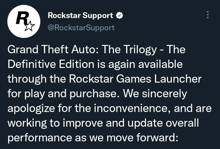 The Rockstar Games Launcher is now back online. However, Grand Theft Auto: The Trilogy - The Definitive Edition will remain unavailable to play or purchase as we work to remove some data files that were unintentionally included in the new versions of these games. We sincerely apologize for the inconvenience and we hope to have the correct versions of the games up and running for everyone as soon as possible. -