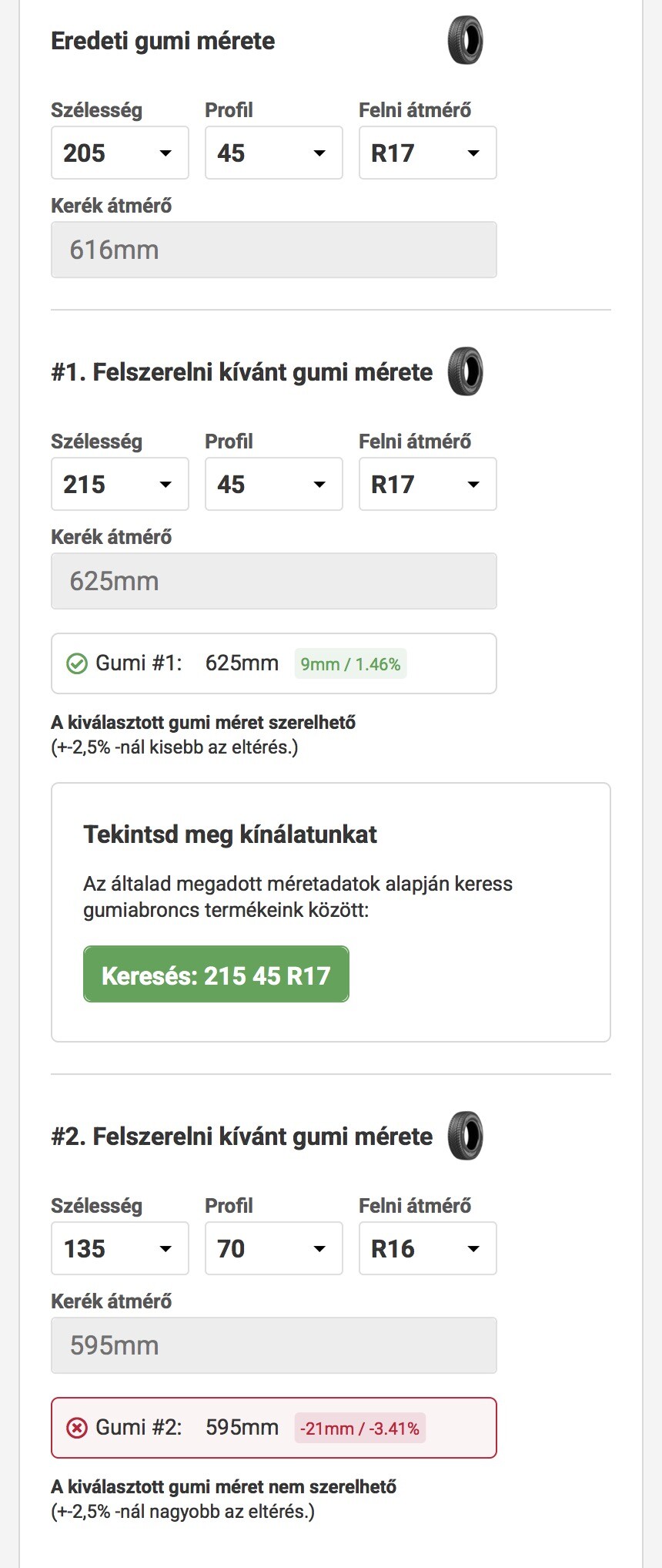 A teljes átmérőt nézve ha az eltérés ±2,5%-on belül van, akkor váltóméret. Az már más kérdés, hogy hivatalosan nem rakhatsz fel akármit csak azért, mert váltóméret, a gyártó pontosan megadja, hogy mi engedélyezett az autódra.