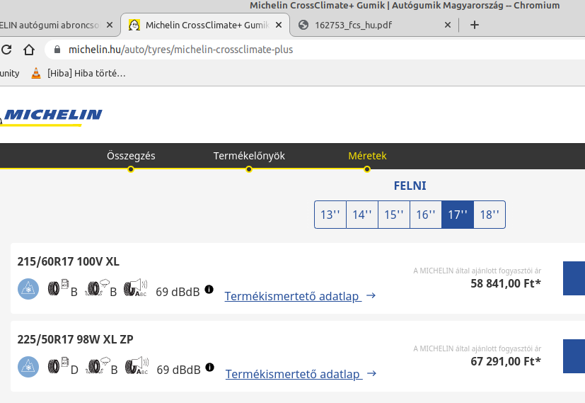 Aztán keservesen csak találtam Michelin 225/50 R17 98W XL TL CROSSCLIMATE+ ZP M gumit a Michelin honlapján (elég gagyi a keresési lehetőség).
