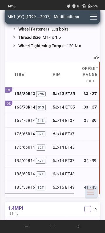 Nézegettem az Automax.hu-n, a 165/70 R14 (ehhez kellene 5" széles felni) és a 185/60 R14 a "régi", ellenben a 195/50 R15 már a második generációs.