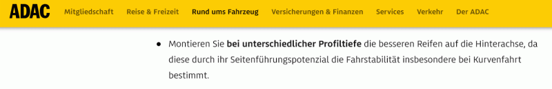 "Ha a gumiabroncsok profilmélysége eltérő, a jobb minőségű gumiabroncsokat szerelje a hátsó tengelyre, mivel ezek oldalirányú tapadási képessége határozza meg a menetstabilitást, különösen kanyarodáskor."