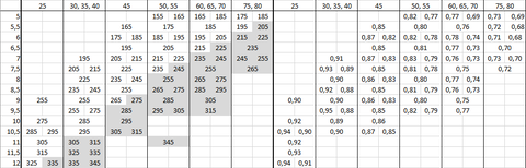 Azonos szélesség esetén a peresebb gumihoz nagyobb szélességű felni kell.Kiírtam a számokat egy táblázatba. Szürkével jelöltem, a korábbi, ismert egyszerű táblázat ajánlásából kilógó értékeket.
