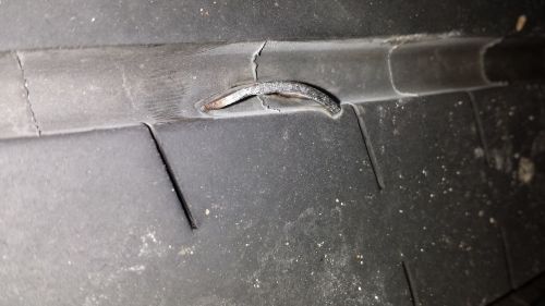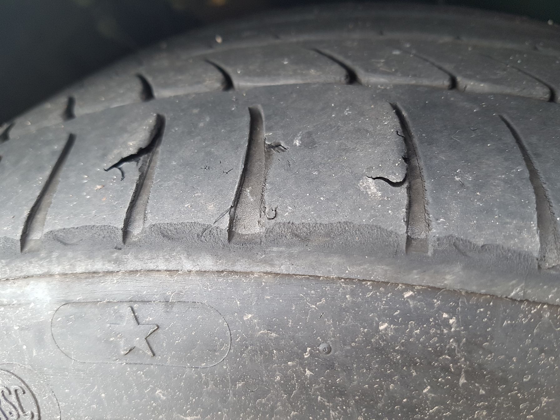 Elso ket gumi, a futofelulet meg 4,5-5mm kozott van vegig, ahol merheto. Ez ugye a futofelulet legszele, ami kicsit kopottabnak tunik, mint a masik reszek. Es ugye lathato a problema, korbe ilyen a bordazas, frankon szetszakadoban van. 7,5k km -el ezelott jo volt, aztan kicsit kemenyebben volt hasznalva az auto, tartosan magas sebesseggel kozlekedes, sok eros fekezessel. Az elejen nem razott, mostanra mar eros fekezesnel raz az auto, es a futasa is hangosabb lett.