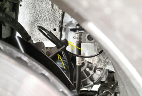 Na a végére jártam a dolognak, elmentem a madaras tesco parkolóba, gondoltam ha centrír a hibás azt én is meg tudom nézni tükörrel mibe ver bele. A bal első, belső oldalon lévó súly csapkodta a fékvezetéket, mert lógott. A képen látható fém tartóvillába nem nyomta rá a szlovák a nyíllal jelölt gumibakot, ami megfelelően eltartja a vezetéket.