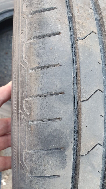 "Mine look the same after only 5000km. Do you see the upper gum is somehow "metling down" I mean peeling off . And what I see is that the shape of rubber thred is crooked and torn.""I have been using kleber q3 for only one year doing 6000km and must say I will make a complaint for 2 tires (those in front). Tire bloks are crooked and a bit worn out. The block rubber 'pills out' so to say. Micro breakings can be observed between tire bloks. I have china goodride 401 AS tires on my second car for 3 years and they (4 of them) look almost as if they were only half of the year on the road making a few kilometers. Very dissapointed with kleber. The reara tires look good yet!"