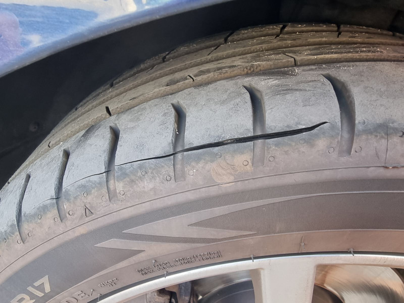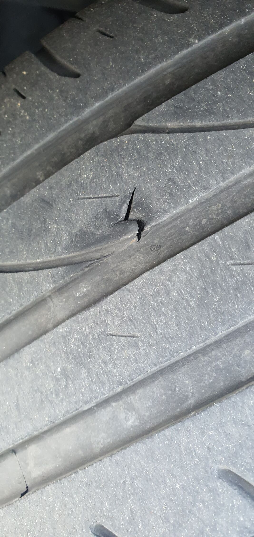Ma reggel észrevettem, hogy a bal első gumin van egy 1-1,5 centis sérülés (repedés). Mélységét nem néztem meg, de van kb.: fél - 1 centi körül.