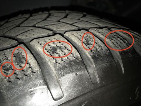 A gumis szerint nyáron autópályán megégett ez a téligumi, és ezért váltak le róla a darabok a bekarikázott részeken. (igaza van, tényleg autópályáztam vele még májusban is)