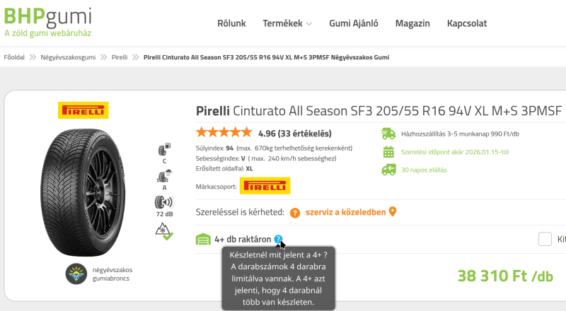 - Pirelli CINTURATO ALL SEASON SF 3 XL 205/55 R16 94VFőleg nedves, havas úton kellene a jobb szereplés (főleg aquaplanning esetében), nem vagyok kanyarvadász, nem szerpentinezek nyáron, szóval a szárazon nyújtott teljesítménye nem baj ha rosszabb (de azért ne nyúljon mint a sajt). Az autó télen-nyáron kint áll, nincs fedett rész, betonon, kövön áll. Tehát az UV eszi rendesen. A gördülési zaj sem ártana, ha csendesebb lenne mint a Quatrac 5, ha jól emlékszem annál az volt az egyetlen/egyik amiben nem szerepelt jól.