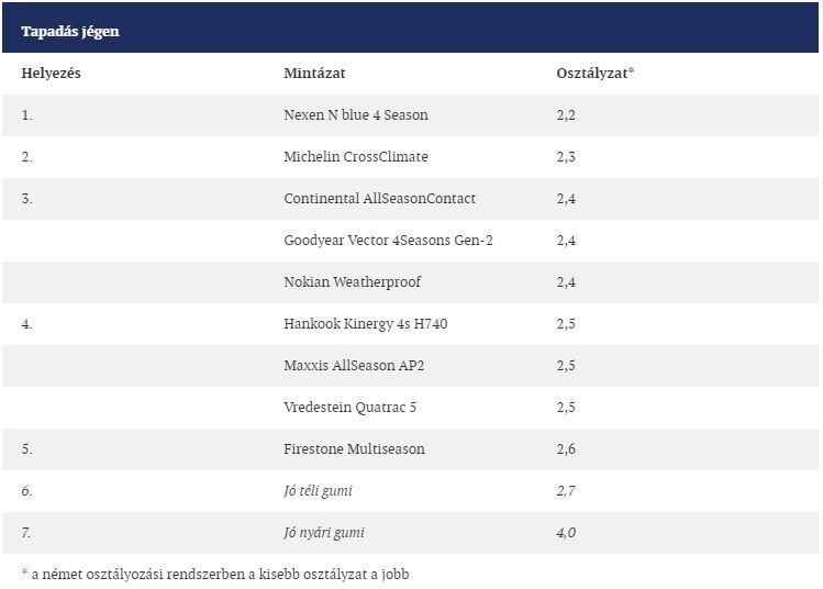 Mindig azt hiányolom, hogy konkrét téli és nyári abroncsokkal is hasonlítsák össze a 4 évszakosokat. Valószínűsítem a gyártók ezt nem engedik.