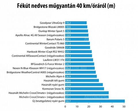Nyilván a hasonlítgatásnak akkor van értelme, ha minden körülmény ugyanaz (autó, levegő-és aszfalthőmérséklet, aszfalt anyaga, stb.), így nincs értelme hogy más körülmények között készültek a nyári és négyévszakos tesztek.