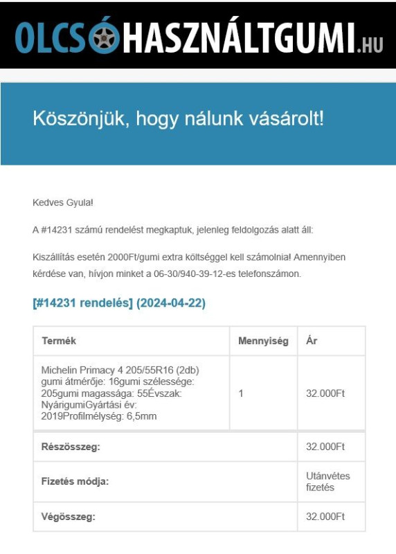 Odaadtam a 35 kp-t, átdobtuk a csomagtartóba a műanyaggal betekert gumikat és már ott sem volt. Még számlát is „elfelejtett adni”, annyira sietett.Nagy nehezen kihámoztam a gumikat a fóliából. Az eredmény: 6.5 mm profilmélység helyett 4.7- max. 5.0 mm (azt, hogy félre vannak e kopva, nem tudtam megnézni)