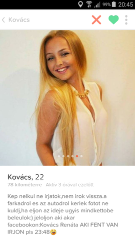 Mondjuk frekventált találtatokat nem nagyon adott, azon az 1-2 gyakorikérdésekes linken kívül, ami azért nem mondható masszív alapnak. Ahhoz képest, hogy tinderen azt szoktad látni, hogy 10-ből 3 csajnál ugyanaz a sablonos "bölcsesség" van kirakva, ez elég jó. Nekem azért szimpi volt, de tény, hogy aki ilyen szöveget rak ki, azért felveti a kérdést, hogy ha nem kurva, akkor minek emlegeti azt, hogy bele fog ülni a farokba. Na mindegy. Nem lett meg az adatlap, azt mondta ismerősöm, hogy már nem ismerőse a csaj, hogy Kovács Renátából olyan sok van, hogy nem is találja.