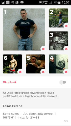 Nekem a 6 képből, amit fel lehet tenni, csak az utolsó olyan, hogy félmeztelen vagyok rajta (mihez tartás végett, ha odáig eljut, azért lássa azt is), kocsimról meg egyáltalán semmi kép nincs. A többin mind próbálok értelmes embernek tűnni, bizalomkeltő arckifejezéssel![;]](//cdn.rios.hu/dl/s/v1.gif)