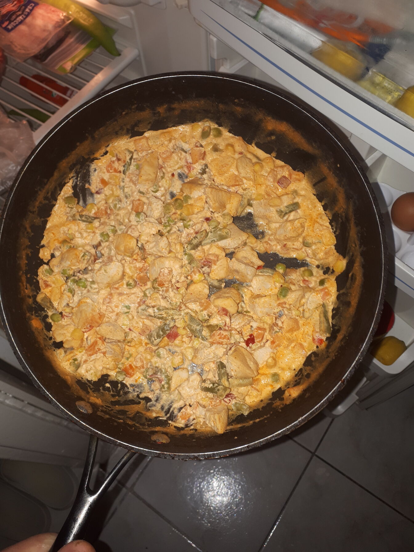 Ma csináltam tejfölös csirkét, zöldséggel, ami 55dkg csirkemell, 25 dkg mexikói, egy nagy pohár 12% tejföl.