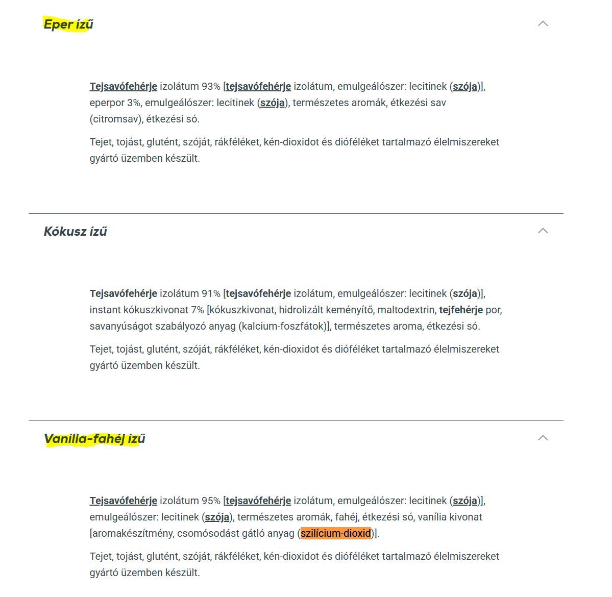 Iso Whey Zero Natural-t [link] iszok, epres ízűt. Ebben kb, nincs semmi. Viszont ugyanez a fehérje "vanília-fehérje ízesítéssel" már tartalmaz szilícium-dioxidot is + egyéb adalékot.