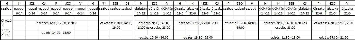 Tehát így dolgozom és edzem, heti 4-5 alkalommal edzek (amikor dolgozom is), ha valaki érdemben tudna valami okosságot javasolni, azt szívesen fogadom. Bár elég kötött a munkabeosztás miatt a program, illetve az edzéseket csak munka előtt-után tudom megejteni, tehát ilyen opció nem jó, hogy pl.: éjszakásban menjek le délben edzeni.