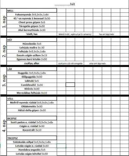 "Egész testes tömegelős jelleggel". Tehát húzodzkodás, tolodzkodás, lábtoló/guggolás, combfeszítő, combhajlító, és vádli. Ez az alap (nekem pl a lábam gyenge és nehezen fejlődik ezért főleg arra megy ez most). És még csinálok váll, hát edzést, has, bicepsz izolációs gyakorlatokat ha belefér az időbe, energia keretbe. (4x8 szériákat szinte mindenből.)Azt kell mondjam így hogy van több regenerációs idő, vannak pozitív jelei/tapasztalataim ezzel kapcsolatban.