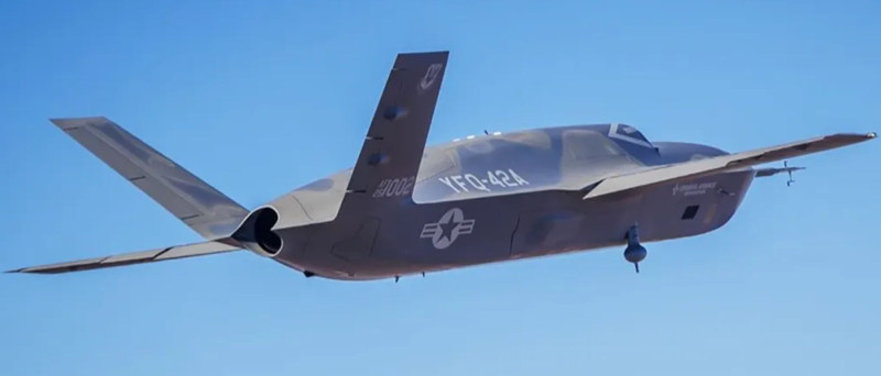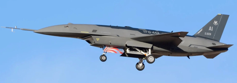 Ha pedig már... repül már az Anduril cég YFQ-44A drónja is. Ez egy CCA / Loyal Wingmen drón, vagyis eredendően az lenne a célja, hogy ember vezette gépekkel együttműködve előre tolt szenzorplatformként, fegyverplatformként, elektronikai hadviselési platformként "kinyújtott kéz" legyen. A hasznos teher relatíve kicsi, kb. 2db légiharc rakéta vagy 2-4 SDB bomba lehet. A sebességük ~Mach 0.9, a hatótávolság pedig 2000 km is lehet