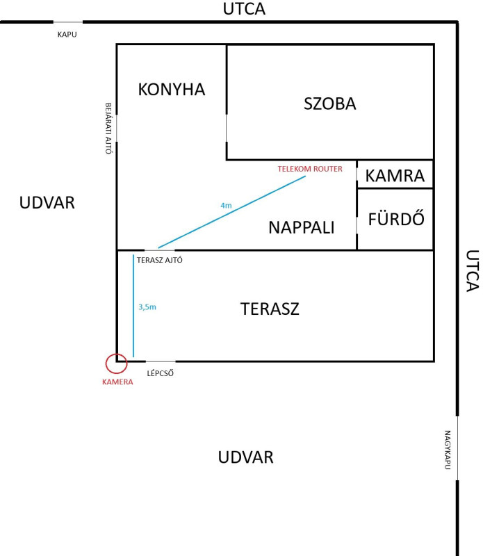 Egy hosszú udvart kellene nézni, igazából úgy van, hogy elől van a ház. Ott nézne egy kamera előre. Oda szerintem elég lenne a gyári 20m madzag.