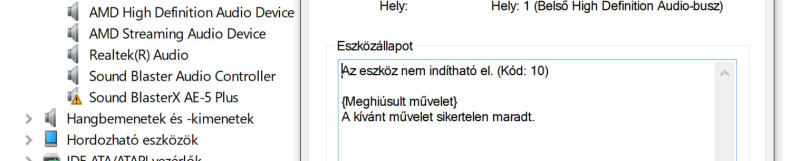 Win10 fut alatta és mint látható, egy Sound BlasterX AE-5 Plus hangkártya. Zsír újan lett véve, és teljesen random módon bekapcsolás után van hogy nem érzékeli a gépem, de van hogy igen. Általában egy újraindítás után menni szokott.