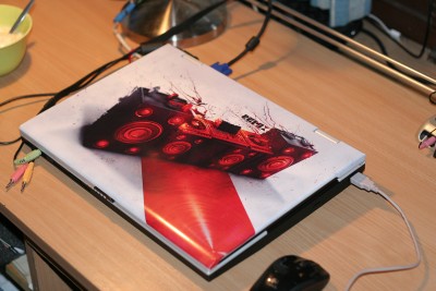 Mivel hülye vagyok a vektoros vágóvonal-készítéshez(meg úgy minden vektorgrafikus dologhoz), így "egyben" kértem a matricát, majd a zsanéroknál illetve ahol lelógott a laptopról(direkt nagyobbat kértem kicsit), ott tapétavágóval igazítottam.