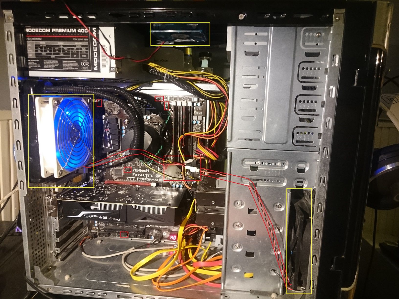 A víz radiátor a hátlapon van, bentről van megfújva, a 12 centis ventilátora (aminek nagyon rövid a kábele és nem ér el max a PWR_FAN csatiig, de a CPU_FAN_2-ig biztosan nem) egy molex->3pin átalakítóval van a ház saját (de szerintem nem működő mert állandó hangú) potis szabályzójára dugva párhuzamosan a borzasztó hangos előlapi 12 centis régi apple gépből származó elvileg önszabályozós (van rajta egy kék bigyó, szerintem termisztor vagy ptc lehet) ventillátorral.