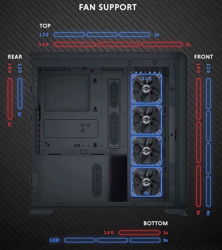 Vettem egy Phanteks Enthoo 719 házat, ebben szeretnék egy hatékony léghűtést összehozni. Egy ATX méretű lap lesz benne, a CPU hűtő valószínűleg Fortis 3 EVO lesz, 140-es ventilátorral.