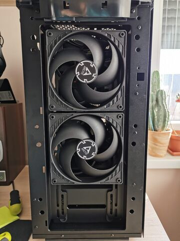 a ventilátor helye alul lenne egy sff házba tolná a levegőt (útközben telibe kapná a rá merőlegesen álló id-cooling is60-at, segítene onnan is elmozgatni a meleg levegőt) és csinálná a pozitív nyomást lehetőleg úgy hogy minél kevesebb por ülepedjen le.