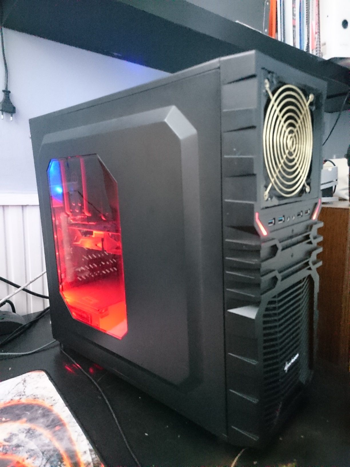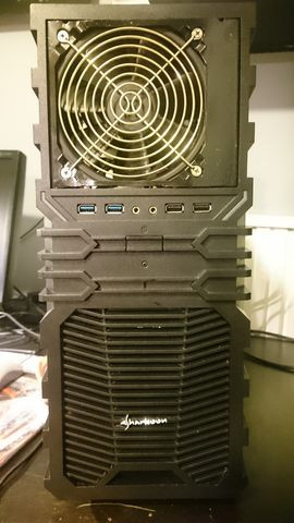 A víz radiátor a hátlapon van, bentről van megfújva, a 12 centis ventilátora (aminek nagyon rövid a kábele és nem ér el max a PWR_FAN csatiig, de a CPU_FAN_2-ig biztosan nem) egy molex->3pin átalakítóval van a ház saját (de szerintem nem működő mert állandó hangú) potis szabályzójára dugva párhuzamosan a borzasztó hangos előlapi 12 centis régi apple gépből származó elvileg önszabályozós (van rajta egy kék bigyó, szerintem termisztor vagy ptc lehet) ventillátorral.