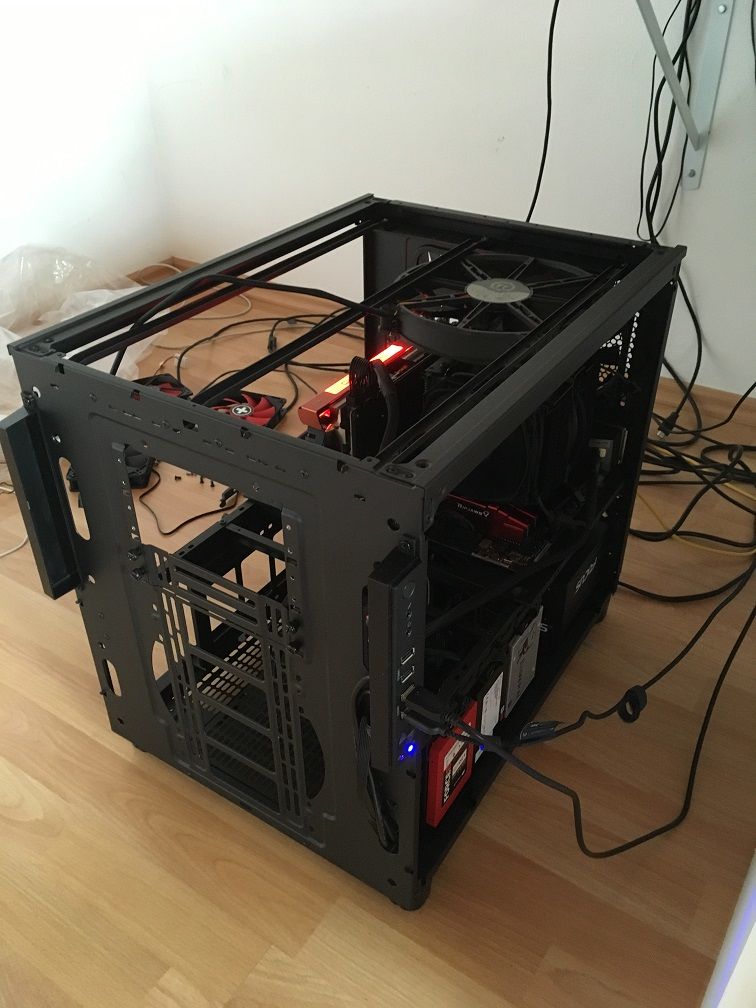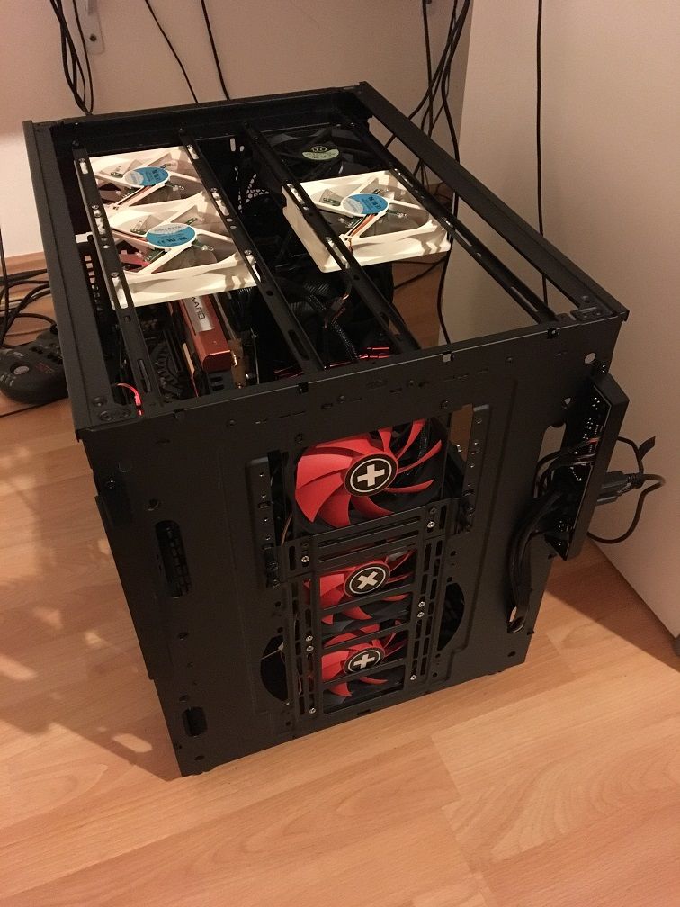 Ez a rendszer egy Thermaltake Core X5ös házban pihen, amelyből a dvd tartó elemek ki lettek szedve, így ott egy elég nagy légrés van. Táp alul, szemből nézve jobb oldalt, és alulról szív levegőt, ha szükséges neki. SSD-k is jobb oldalon helyezkednek el.