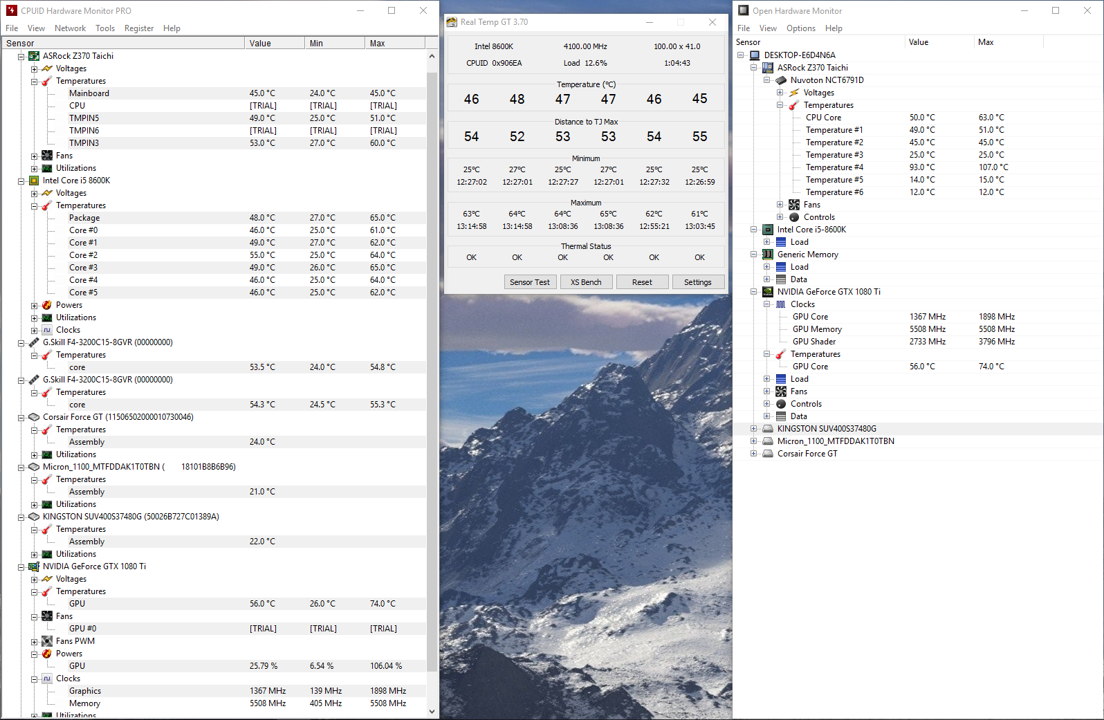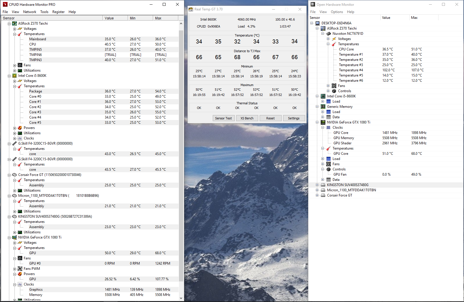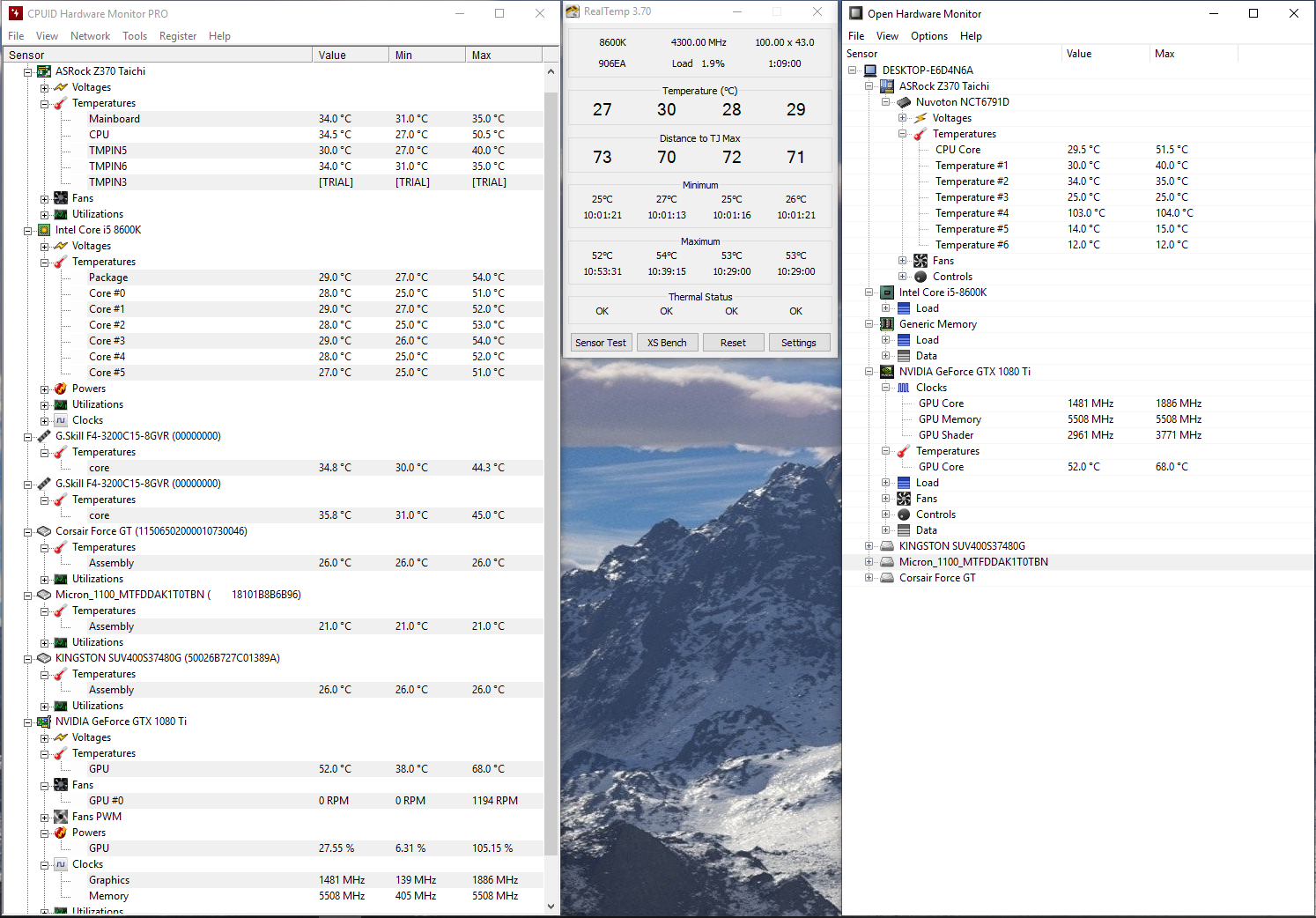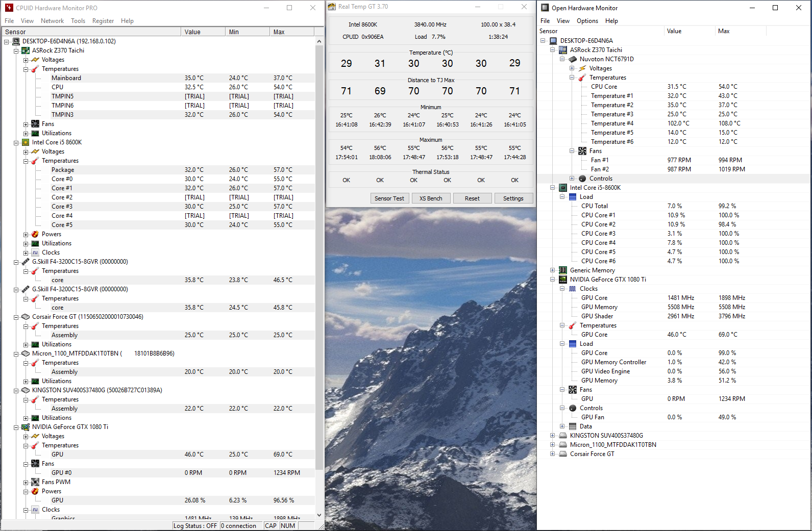 Kiindulási pontnak azt vettem, hogy adott a TT Core X5ös gépház, benne egy Gainward 1080Ti, meg egy 8600K egy Dark Rock Pro 4-el hűtve. És ennyi, nincs plusz venti. Ekkor a gép szinte hangtalan, a videókártya idle lekapcsolja a ventiket, az SW3-at pedig alig hallani. A cél az lenne, hogy ettől nem jelentősebb zajterhelés mellett megfelelő hűtés legyen.