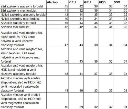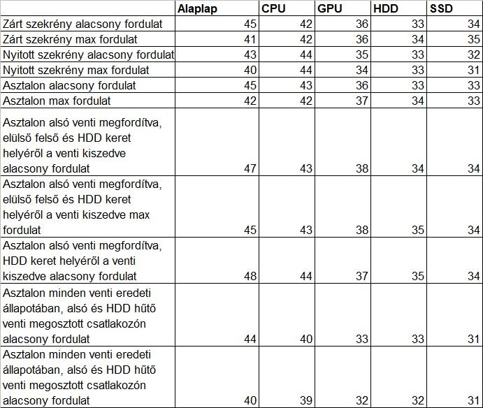 A mérésről: Minden esetben idle állapotot mértem, a bekapcsolástól számított 10. perc körül. Utána kikapcsoltam és 5-10 perc múlva mértem a következőt. Az első hat sorban a mostani ventilátorelrendezést mértem különböző helyzetekben. A 7-8 sorban a Pete55555 által javasolt elrendezést próbáltam ki max és alacsony fordulaton, a 9. sorban megpróbáltam javítani valamit rajta, hogy a felsőt visszakötöm, de azt már max. fordulaton nem is mértem. Az utolsó sorban mindent visszaraktam az eredeti helyére és a HDD és az alsó ventilátort az Y elosztóval kötöttem be. Itt hozzá kell tennem, hogy az alsó két sort mivel más dolgom is volt, már este mértem és mivel lehűlt kicsit a levegő ezért alacsonyabbak a hőfokok a fenti 6-7. sorhoz képest, a hűtés nem lett hatékonyabb.