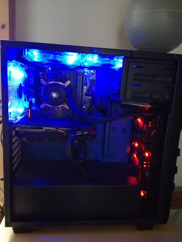Csatoltam a képet a gépről. A pirosan világító ventik befújnak, míg az összes kék kifúj. A 2 piros venti a vízhűtés radija mögött van, mint látjátok. A kék ventik 14 centisek, a pirosak 14-esek, a ház pedig a Sharkoon DG7000.