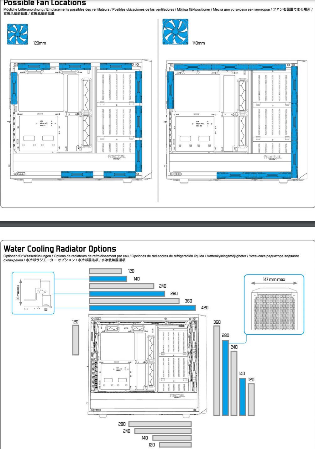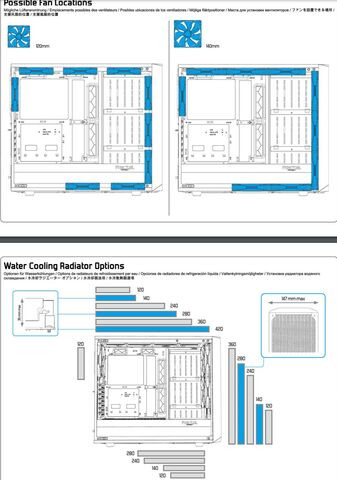 3 BEfele fújó 140-es (abból csak egy "minőségi" BQ Pure Wings 2) 4 pines PWM-es, másik 2 Fractal Design X2 GP-14 3 pines DC venti, ahogy hátul is a KIfele fújó egy ilyen darab.