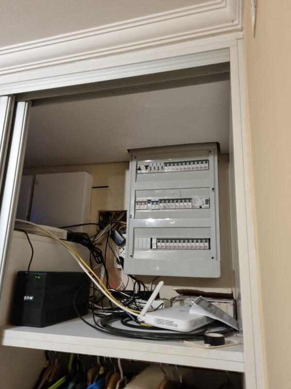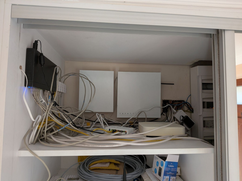 A képen látható kábelrengeteget szeretném valahogy rendbe szedni, esztétikussá tenni. Unokatesómnál láttam egy rack szekrényt, es valami hasonló kialakítást szeretnék én is. Patch panel, switch, ONT, router, NVR, PDU. A probléma az hogy itt van a riasztó panel, es az akku, szóval a hozzáférhetőség ezekhez meg kéne maradjon. Ahogy látjátok, ez egy beépített szekrény felső polca. Itt van jobb oldalon a kapcsoló szekrény, es egy UPS, meg az ONT, bal oldalon a switch mellett a fali UTP csatik, router, NVR. A kábelek középen mennek fel a szobákba , illetve a kinti kamerákhoz. Ide jön le fentről az optikai kabel, a koax. Szóval minden UTP és telekommunikációs cucc szíve itt van. Ezt szeretném valahogy dekorativva, átláthatóvá, kezelhetővé tenni. Ötleteket gyűjtök egyelore. ChatGPT-vel sokat beszélgettem már, ilyesmit ajanl.