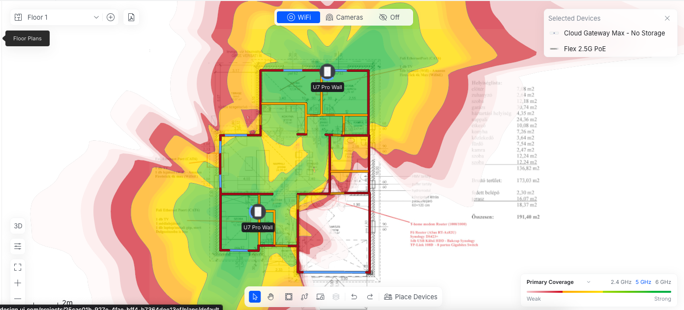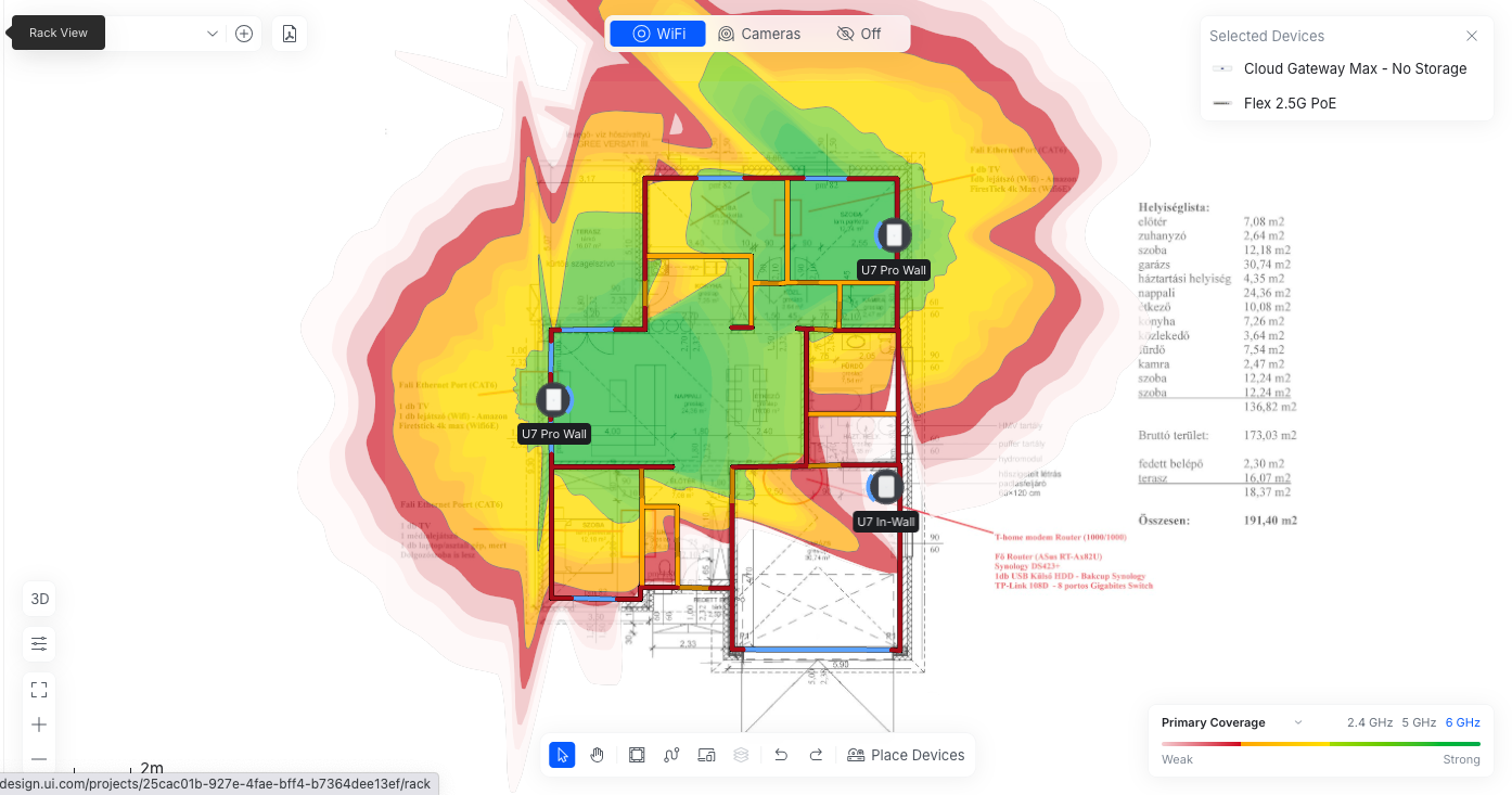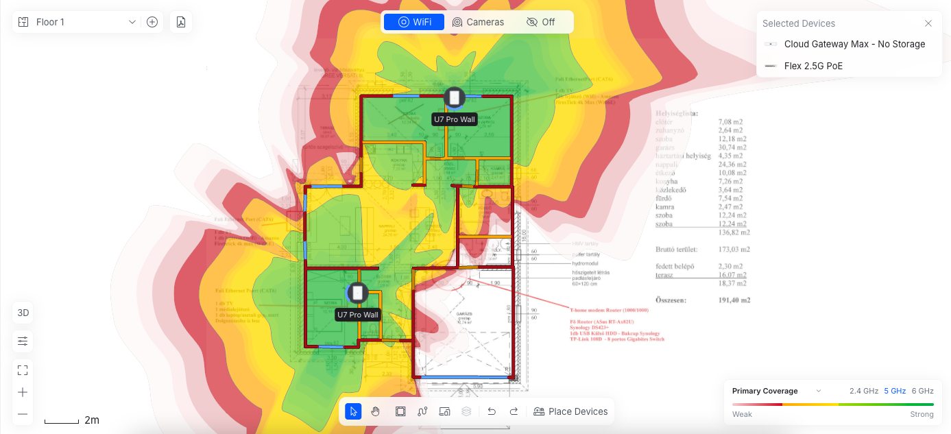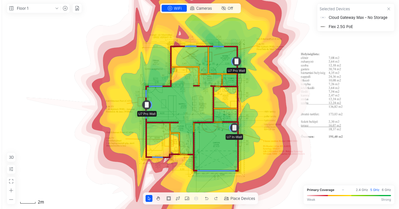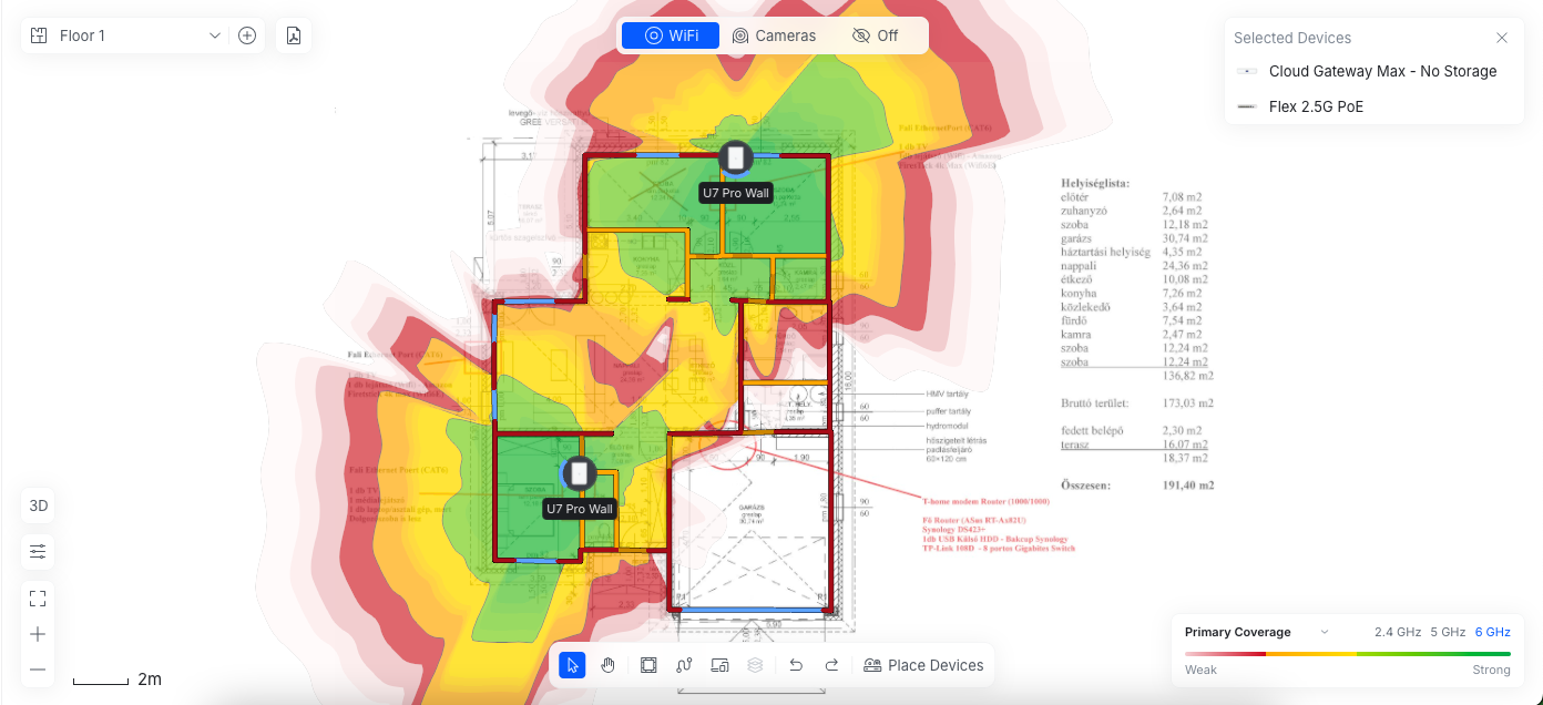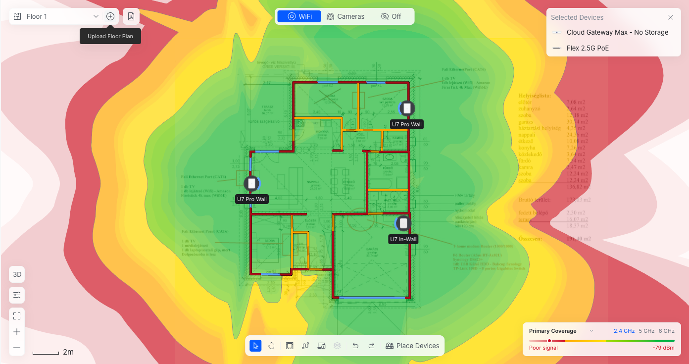 A wall típusú AP-oknak kicsit más a szórási képe mint a mennyezetre szerelhetőnek, és nehezebb is megfelelő helyre tenni. Csináltam gyorsan a kinézett Pro-Wall AP-okkal 2.4GHz 5GHz és 6GHz várható lefedettséget. Kettőt nem is lehet elhelyezni úgy, hogy legalább az 5GHz-en teljes lefedettség legyen, ezért a garázsba tettem egy U7 In WAll-t, a garázs, a fürdő és ht helységben nem lesz 6GHz. A bal oldai AP 2.5m magasan van(gondolom azon a falon lesz TV), a két jobb oldali 50cm-en. Viszont ez csak várható lefedettség, a program "átlagos" csillapításokkal számol a falak, ajtók, ablakok, stb. tekintetében, hogy pontosabb képet kapjunk, kellenének helyszíni mérések is. Ez inkább csak erős közelítés. Én első körben vennék egy AP-t itthon, feltenném ideiglenesen a kiválasztott helyekre és körbemérném egy telefonnal, hogy megfelelő-e a jelerősség. Ha megfelel, megvenném a többi eszközt, ha nem van 14 napos elállással, és néznék mást. Így minimalizálható az anyagi veszteség, ha mégsem válna be az AP.