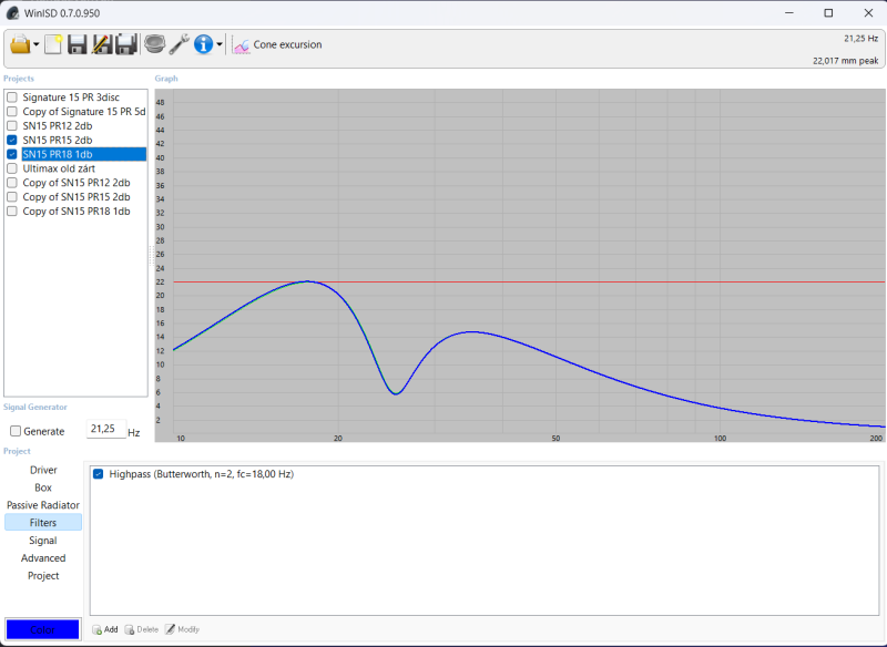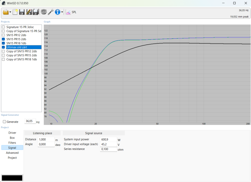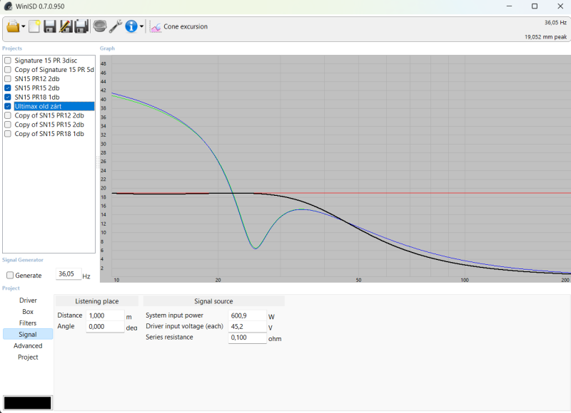 Aztán jött az ötlet hogy a jelenlegi ultimaxot passzív membránosra csinálom Signaturre nyomóval és hozzá való passzív membránnal ( továbbiakban PR-nek nevezem). PR-t súlyokkal lehet hangolni és a jelenlegi láda kicsi neki szimuláció alapján. Vagy a frekimenet nem lesz jó vagy a x-max-ba ütközik a hangsugárzó vagy a PR.