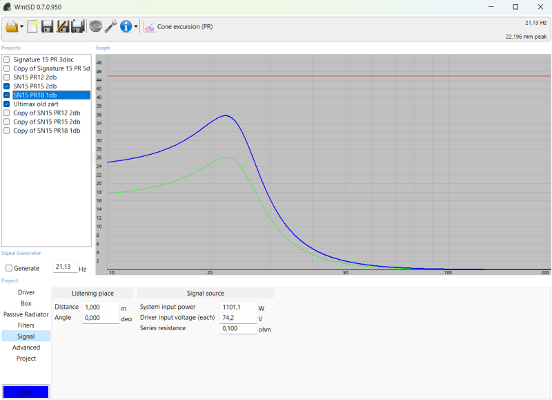 A signature 1100 W esetén 21Hz-nél éri el az Xmax-t ami 22mm. Akár 160 literre is növelem a láda méretet akkor is 20hz-en Xmax van Signatur-nál.