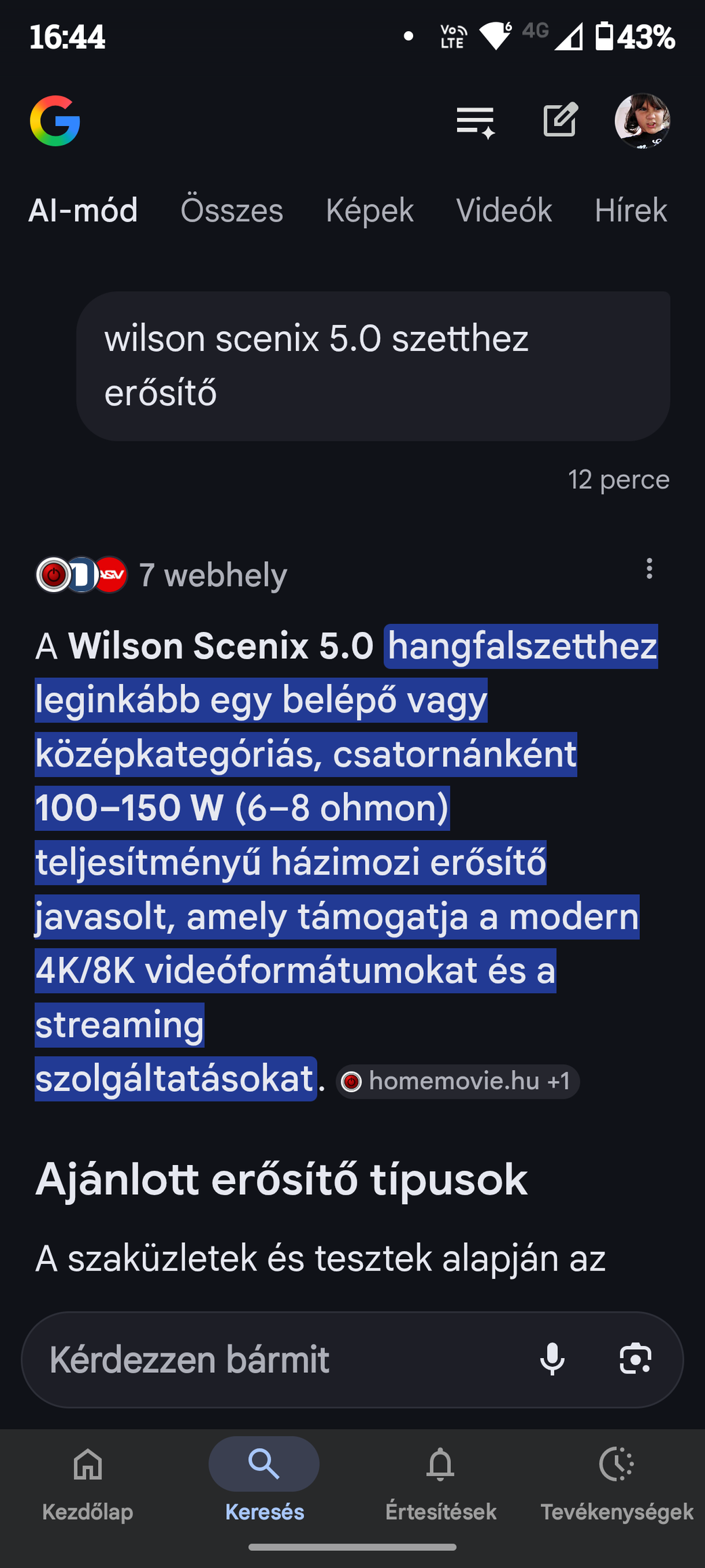 Ai mit írt a hangfal szettemről és milyen erősítőt ajánl hozzá