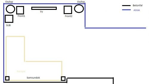 Tegnap sorround elhelyezes kerdesre, csinaltam gyorsan egy paint alap rajzot. Otleteket varnek az elhelyezesre, jo ez igy? Milyen magasra tegyem a sorroundokt, a sub jo helyen van e ott? Be kene meg zsufolnom egy lemezjatszot is, annak hol lenne jo helye.